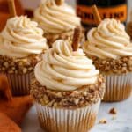 - Assemble the Cupcakes: Using a large round piping tip, pipe a circle of frosting onto each fully cooled cupcake. Optionally, sprinkle chopped pecans over the frosting. Then, use a large star piping tip to add a swirl of frosting on top, and adorn with whole cinnamon sticks if desired for an extra festive touch.