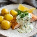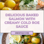 Keywords: baked salmon, cold roe sauce, fish roe, Greek yogurt sauce, lemon salmon, healthy seafood, baby potatoes side, dill salmon recipe