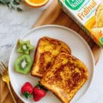 - Serve: Remove the French toast from the pan and plate. Top with maple syrup and fresh fruits as desired. Optionally, sprinkle a dash of cinnamon sugar on top for added flavor.