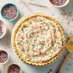 This Birthday Pie is a creamy, fun, and festive dessert featuring a smooth blend of cream cheese, vanilla pudding, marshmallow fluff, and whipped topping folded with colorful rainbow sprinkles, all set in a crunchy graham cracker crust. Perfect for celebrations, it requires no baking and chills overnight for the best texture and flavor.