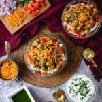 - Garnish: Sprinkle diced onions, tomatoes, chopped mint and cilantro, and sev or crushed papri on top for added texture and flavor.