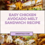 A delicious and satisfying Chicken Avocado Melt Sandwich featuring juicy grilled chicken breast, creamy avocado, melted cheese, and fresh vegetables layered between toasted bread with a tangy mayo and Dijon mustard spread.