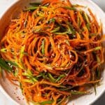 A vibrant and spicy Chili Crisp Carrot Salad made with crisp matchstick carrots, scallions, fresh cilantro, and a flavorful dressing of toasted sesame seeds, honey, ginger, and homemade chili crisp oil. This refreshing salad balances heat and sweetness with a satisfying crunch, perfect as a light side dish or appetizer.