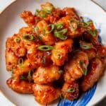 - Garnish and serve: Remove the pan from heat, garnish the dish with sliced green onions, and serve the Cho0 Choo Chicken hot for maximum flavor and texture.