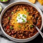 - Serve and Garnish: Spoon the chili into bowls and top with shredded cheddar cheese, a dollop of sour cream, and chopped green onions. Add crunchy tortilla chips on the side for extra fun and texture.