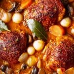 Coq Au Vin is a classic French dish featuring tender chicken slowly simmered in a rich sauce of Burgundy wine, chicken broth, vegetables, and aromatic herbs. This rustic and comforting recipe combines seared chicken thighs with savory mushrooms, onions, carrots, and garlic, resulting in deep flavors perfect for a hearty meal.