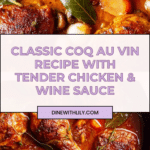 Coq Au Vin is a classic French dish that combines tender chicken braised slowly in red wine with mushrooms, onions, and aromatic herbs. This hearty and flavorful dish is perfect for cozy dinners and is sure to impress your family or guests.