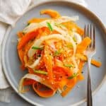 A refreshing and crunchy Daikon Carrot Salad tossed in a flavorful sesame ginger dressing. This quick and easy salad features thin ribbons of carrot and daikon radish, lightly dressed with toasted sesame oil, rice vinegar, fresh garlic, and ginger, then sprinkled with sesame seeds. Perfect as a light side dish or appetizer, it offers a delightful balance of textures and an invigorating Asian-inspired flavor.