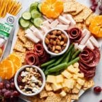 - Add fresh produce: Place the fresh produce in small clusters strategically around the board. Include seedless red grapes, mandarin orange segments, snap peas, sliced Persian cucumber, and baby carrots to add color, freshness, and crunch.