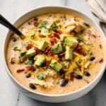 Keywords: chicken taco soup, easy soup recipe, comfort food, slow cooker soup, Instant Pot soup, vegetarian tortellini soup
