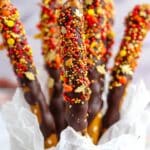 - Decorate Classic Rods: While the chocolate is still wet, sprinkle 2 tablespoons of fall-themed sprinkles over the dipped portion of the pretzel rods.