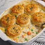 Keywords: chicken pot pie casserole, easy chicken casserole, homemade chicken pot pie, comfort food, biscuit topping