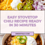 Keywords: easy chili recipe, stovetop chili, quick chili, ground beef chili, one pot chili, weeknight chili, kid-friendly chili
