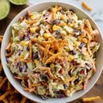 Keywords: cowboy cabbage salad, Frito salad, chipotle dressing salad, southwestern salad, no-cook salad, coleslaw mix salad, black bean corn salad