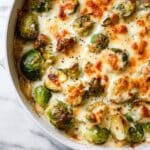 Keywords: Brussels sprouts au gratin, creamy Brussels sprouts, garlicky au gratin, cheesy vegetable side dish, baked Brussels sprouts