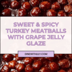 These glazed turkey meatballs with grape jelly and chili sauce offer a delightful sweet and spicy flavor combination. Made with lean ground turkey and finely minced onions, they are browned in a skillet, baked for tenderness, and then coated in a luscious glaze perfect as an appetizer or main dish.