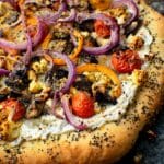Keywords: Gyro pizza, Tzatziki sauce, Greek pizza, Mediterranean pizza, homemade pizza dough, gyro meat pizza, roasted vegetables pizza