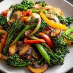 A quick and flavorful recipe for healthy sautéed vegetables featuring a colorful medley of broccoli, carrots, bell peppers, zucchini, snap peas, and mushrooms. Perfect as a nutritious side dish, these vegetables are cooked to crisp-tender perfection with garlic, onion, and a touch of lemon juice and balsamic vinegar, then garnished with nuts, seeds, fresh herbs, and Parmesan cheese or nutritional yeast.