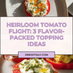 This Heirloom Tomato Flight is a vibrant and fresh appetizer featuring thick slices of ripe heirloom tomatoes topped with a selection of flavorful and textural combinations. Each tomato slice is enhanced with flaky salt and then adorned with either basil pesto and creamy cottage cheese, savory Coppa with crunchy pistachios and sweet hot honey, or a generous scoop of rich baked feta egg salad. This no-cook recipe is perfect for a light snack or elegant starter, highlighting the natural sweetness and juiciness of heirloom tomatoes paired with complementary toppings to excite your palate.