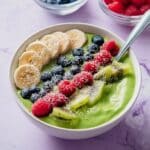 Green smoothie bowls are best enjoyed fresh. If you have leftovers, store them in an airtight container in the refrigerator for up to 24 hours. Stir well before eating. Avoid freezing the prepared bowl, as toppings may lose their texture.