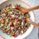 - Combine Ingredients: In a large bowl, add the drained bulgur, chopped vegetables, pomegranate seeds, parsley, mint, and diced red onion.