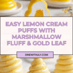 Lemon Cream Puffs are an elegant and delightful dessert featuring a crisp white chocolate shell tinted yellow, filled with a tangy homemade lemon curd and a fluffy marshmallow cream, all resting on a sweet marzipan base. Finished with a touch of edible gold leaf, these treats combine rich textures and flavors for a sophisticated bite-sized indulgence.