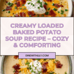 Loaded Baked Potato Soup is a creamy, hearty soup that captures the comforting flavors of a classic loaded baked potato in a warm, velvety bowl. Made with tender russet potatoes, sautéed vegetables, rich cream, and sharp cheddar cheese, this soup is perfect for chilly days and family gatherings. It’s quick to prepare, budget-friendly, customizable, and loved by both adults and kids.