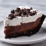 - Make the Topping: In a large bowl, beat the 2 cups cold heavy cream and mascarpone cheese with an electric hand mixer on medium speed until stiff peaks form, approximately four minutes. Dollop the mascarpone whipped cream evenly over the set chocolate filling. Sprinkle generously with chopped or shaved mint chocolate candies.