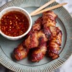 Delicious pigs in blankets made with chipolata sausages stuffed with creamy brie and tangy cranberry sauce, wrapped in crispy streaky bacon, and served with a warm cranberry and wholegrain mustard dipping sauce. Perfectly cooked in an air fryer for a crispy, flavorful appetizer or snack.