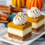 - Serve: Remove the bars from the refrigerator, slice into squares, and optionally garnish with whipped cream and a sprinkle of pumpkin pie spice. Enjoy!