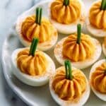 Keywords: deviled eggs, pumpkin deviled eggs, Halloween appetizers, fall party food, easy deviled eggs, festive appetizers