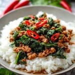 Quick Thai Basil Chicken is a flavorful and aromatic stir-fry dish featuring ground chicken cooked with garlic, chilies, and Thai basil, balanced with a blend of savory soy sauces, oyster sauce, and a touch of sweetness from maple syrup. Ready in under 30 minutes, it’s a perfect weeknight meal served over steamed rice and garnished with fresh herbs and optional crunchy prawn crackers.