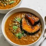 Keywords: Roasted squash stew, split pea stew, vegetarian stew, winter squash recipe, healthy dinner, roasted pepitas, autumn soup