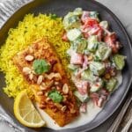 Sayadieh is a traditional Middle Eastern fish and rice dish known for its aromatic spiced rice and rich tomato sauce. This recipe features perfectly cooked basmati rice infused with warm spices like coriander, cumin, turmeric, and saffron, alongside pan-fried fish filets dusted with paprika and served with a flavorful tomato and cilantro sauce. Garnished with fresh herbs, nuts, and lemon wedges, this dish brings vibrant flavors and textures together for a satisfying meal.