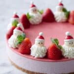 - Optional Strawberry Santas: Take 8 reserved strawberries, cut off top 1/3 as hats. Pipe whipped cream onto bottom halves and place hats on top. Use black sesame seeds, flax seeds or mini chocolate chips for eyes, pipe small cream dots as hat pom-poms and buttons.