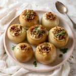 These Stuffed Onions with sun-dried tomato and hazelnuts are a delicious vegetarian dish perfect as a hearty appetizer or light main. Large onions are roasted and then hollowed out to be filled with a flavorful mixture of giant couscous, toasted hazelnuts, sun-dried tomatoes, vegan feta, fresh herbs, and warming chili flakes. A final bake with optional vegan cheddar-style cheese creates a bubbling, golden top that is both comforting and elegant. This recipe is ideal for a plant-based diet and offers a delightful combination of textures and Mediterranean-inspired flavors.