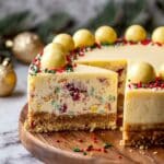 This festive Sugar Cookie Cheesecake combines a buttery sugar cookie crust with edible cookie dough balls folded into a creamy cheesecake filling, all topped with a smooth white chocolate ganache. Perfect for the holidays, it features colorful Christmas sprinkles throughout and a water bath baking method for a luscious, perfectly textured dessert.