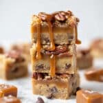 - Add Caramel and Nuts: Pour the warm caramel evenly over the cookie dough base layer. Sprinkle the chopped pecans over the caramel to cover.