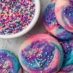 Keywords: Unicorn Cookies, tie-dye cookies, sugar cookies, colorful cookies, sprinkles cookies, butter cookies, fun dessert, party cookies