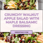 A refreshing Walnut Apple Salad featuring spring mixed greens, crisp Granny Smith or Honeycrisp apples, toasted walnuts, sharp cheddar or feta cheese, dried cranberries, and a homemade maple balsamic vinaigrette. Perfect for a light lunch or a vibrant side dish.