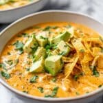 - Serve and Garnish: Ladle the white chicken chili into bowls and garnish with fresh cilantro, shredded cheese, avocado slices, green onions, and crunchy tortilla chips if desired. Enjoy warm!