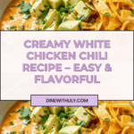 This creamy and comforting White Chicken Chili is packed with tender shredded chicken, great northern beans, green chilies, and a blend of warming spices. Perfect for a cozy dinner, it offers a delightful twist on traditional chili with a smooth texture enhanced by pureed beans and a touch of sour cream or Greek yogurt. Garnish with fresh cilantro, shredded cheese, avocado, and crunchy tortilla chips for a deliciously satisfying meal.