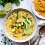 - Serve and Garnish: Spoon the white chicken chili into bowls. Add a squeeze of fresh lime juice and garnish with your choice of chopped cilantro, avocado slices, sliced jalapenos, shredded cheese, and crispy tortilla strips or crushed chips. Serve hot and enjoy a hearty, flavorful meal.